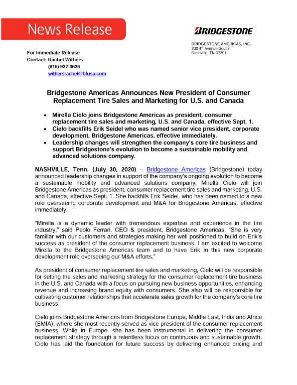 Bridgestone Americas (Bridgestone) today announced leadership changes in support of the company’s ongoing evolution to become a sustainable mobility and advanced solutions company. Mirella Cielo will join Bridgestone Americas as president, consumer replacement tire sales and marketing, U.S. and Canada, effective Sept. 1. She backfills Erik Seidel, who has been named to a new role overseeing corporate development and M&A for Bridgestone Americas, effective immediately.