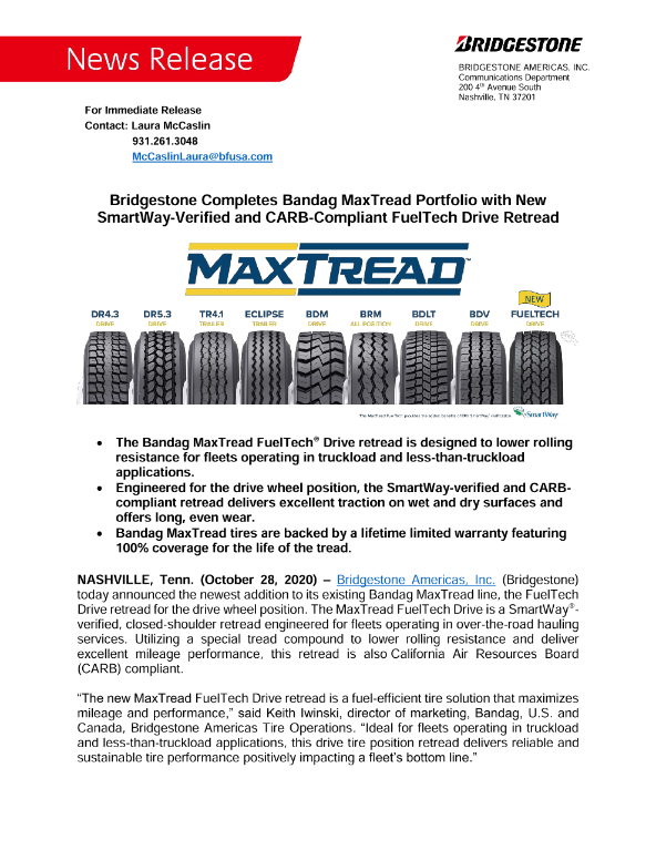 Bridgestone Completes Bandag MaxTread Portfolio with New SmartWay-Verified and CARB-Compliant FuelTech Drive Retread