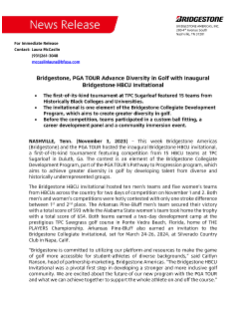 In September 2023, Bridgestone and PGA TOUR announced the launch of the Bridgestone Collegiate Development Program, which is focused on developing talent from diverse and historically underrepresented groups and creating equitable access for current and future generations. The next event within the program will be the HBCU Coaches Summit, which will connect golf coaches from HBCU schools with other leaders in the collegiate and professional space to develop their game knowledge and offer insights into how to prepare their teams for future success.