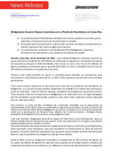 “Esta nueva inversión representa un gran paso en la capacidad de producción de neumáticos de Bridgestone, a la vez que renueva nuestro compromiso de contribuir en el desarrollo económico y social de Costa Rica,” comentó Alfonso Zendejas, presidente de Bridgestone Latinoamérica Norte. “Esta inversión refuerza el compromiso de Bridgestone con Costa Rica como un lugar estratégico para las actividades comerciales locales y globales; pero, sobre todo, maximizar nuestra capacidad de crear valor para todos.”